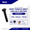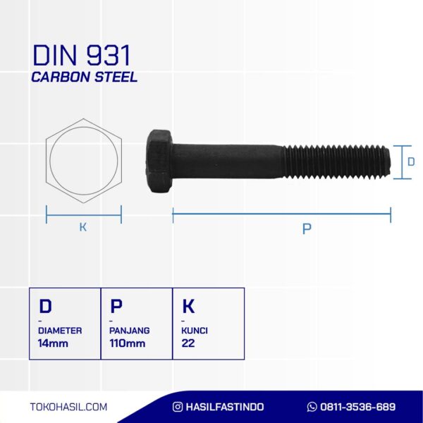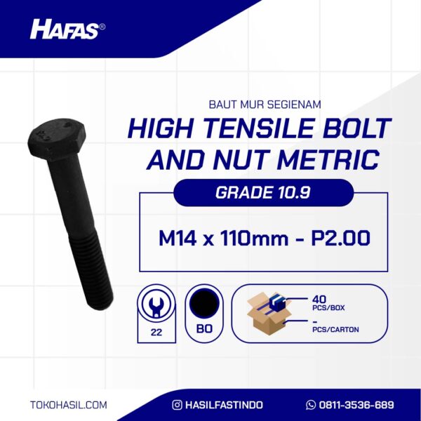 HIGH TENSILE HEXAGONAL BOLT METRIC 10.9 DIN 931 BLACK OXIDE M14 X 110MM P2.00n(DOUBLE HEXAGON BOLT STEEL 10.9 DIN 931 BLACK M14 X 110MM P2.00)nnDiameter: M14nLength: 110mmnMaterial: Alloy SteelnCoating: Black OxidenPitch: P2.00nLock: k22nStandard: DIN 931nClass: 10.9nHead Shape: Hexagon HeadnMin Tensile Strength (Mpa): 1040nProof Load (Mpa): 830nMin Yield Strength (Mpa): 940