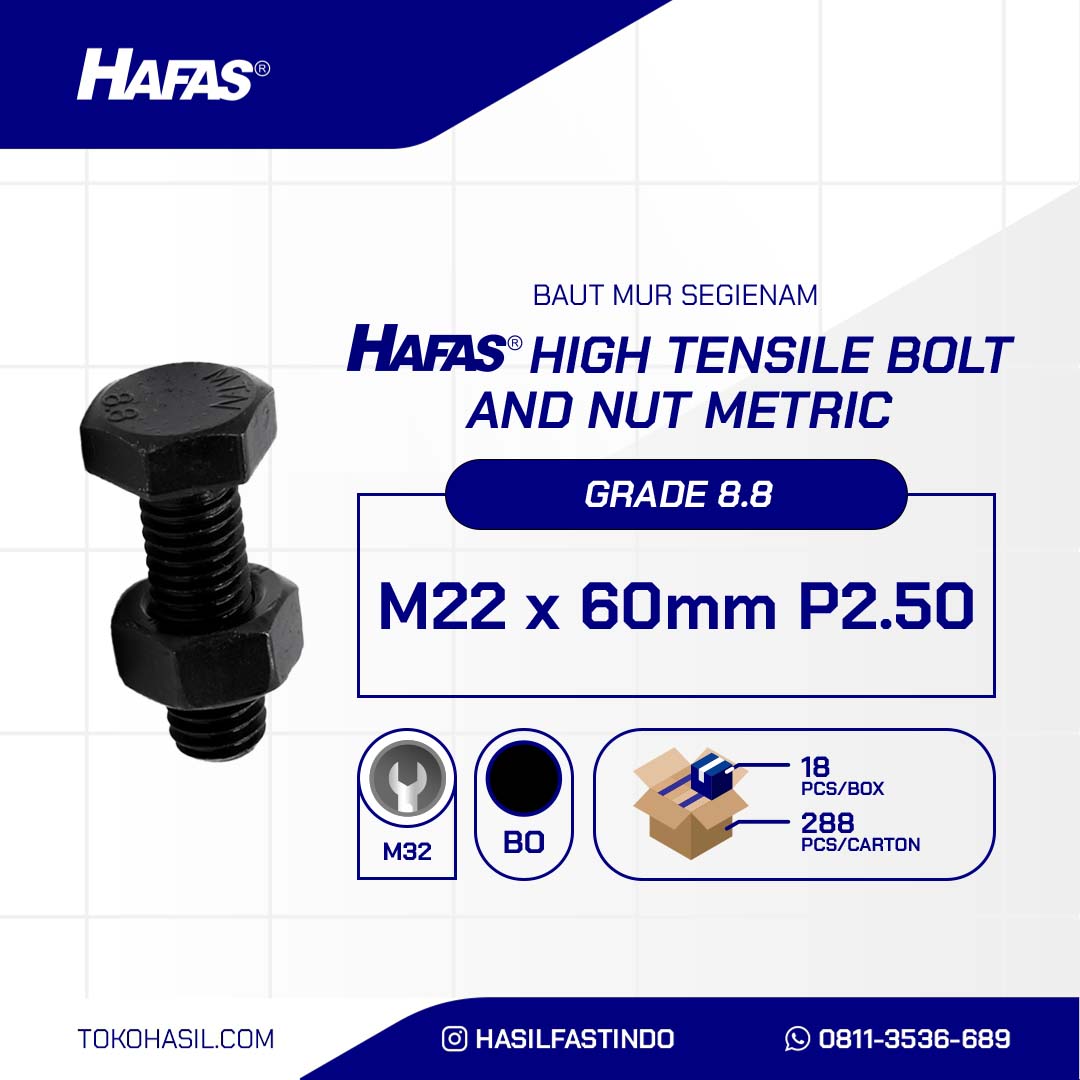 HIGH TENSILE HEX BOLT AND NUT 8.8 METRIC DIN 933 BLACK OXIDE M22 X 60MM P2.50 n(BOLT NUT HEXAGON STEEL 8.8 MILI DIN 933 BLACK M22 X 60MM P2.50)nnDiameter: M22nLength: 60mmnMaterial: SteelnCoating: Black OxidenPitch: P2.50nKey: k32nStandard: DIN 933nClass: 8.8nHead Shape: Hexagon HeadnMin Tensile Strength (Mpa):830