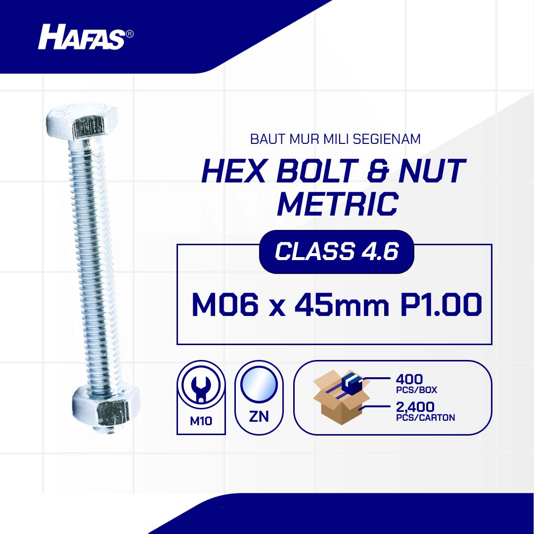 HEX BOLT AND NUT 4.6 METRIC DIN 933 WHITE M06 X 45mm P1.00 n(BOLT NUT HEXAGON 4.6 DIN 933 WHITE M06 X 45 P1.00)nnDiameter: M6nLength: 45mmnMaterial: IronnCoating: White Zinc PlatednPitch: P1.00nKey: k10nStandard: DIN 933nClass: 4.6nHead Shape: Hexagon HeadnMin Tensile Strength (Mpa):400