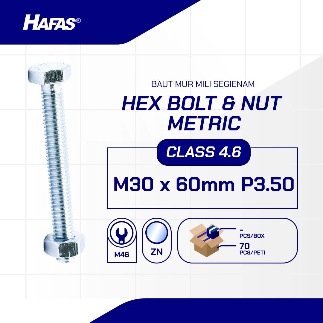 HEX BOLT AND NUT 4.6 METRIC DIN 933 WHITE M30 X 60mm P3.50n(BOLT NUT HEXAGONAL 4.6 DIN 933 WHITE M30 X 60 P3.50)nnDiameter: M30nLength: 60mmnMaterial: IronnCoating: White Zinc PlatednPitch: P3.50nKey: k46nStandard: DIN 933nClass: 4.6nHead Shape: Hexagonal HeadnMin Tensile Strength (Mpa):400