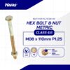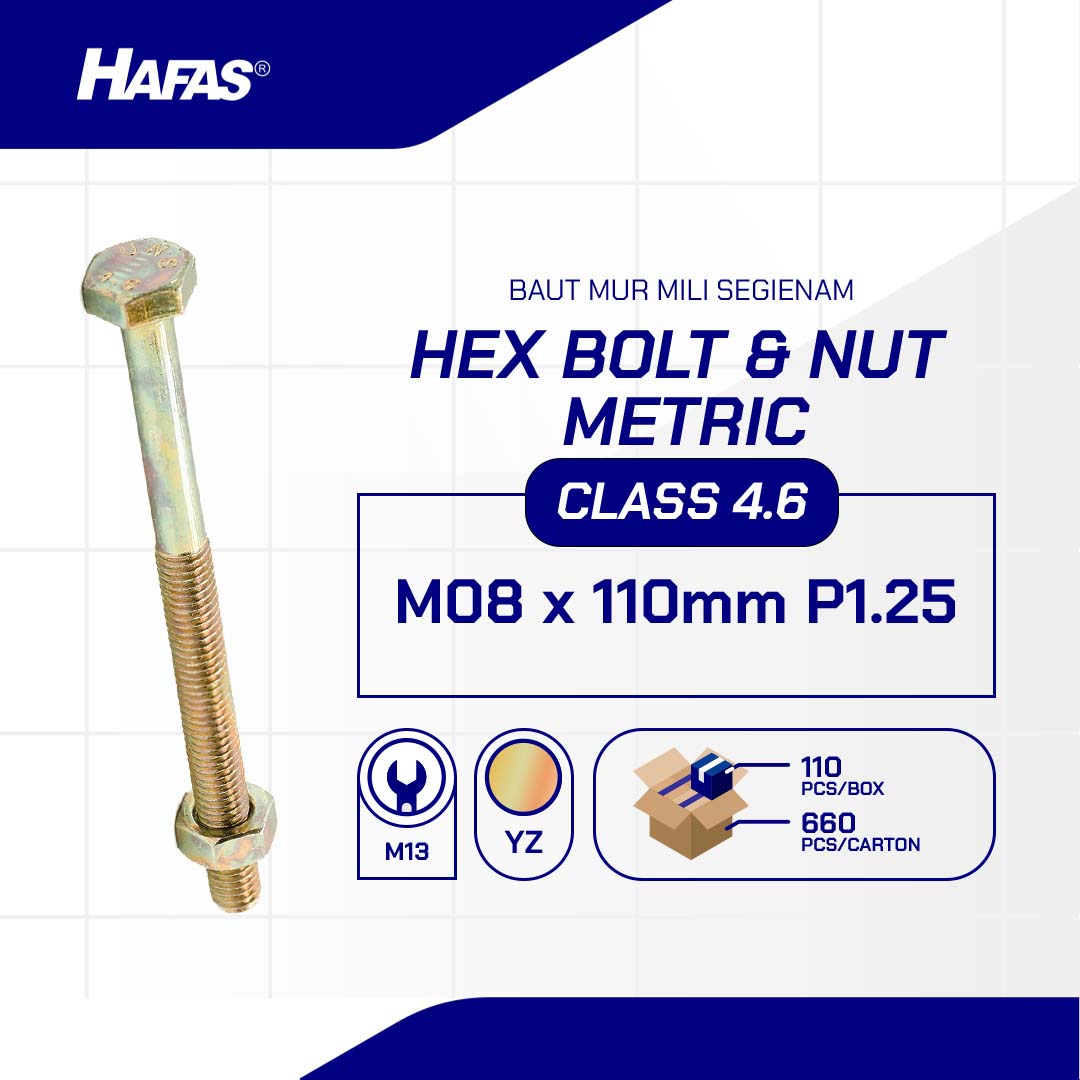 HEX BOLT AND NUT 4.6 METRIC DIN 931 YELLOW ZINC PLATED M08 X 110mm P1.25 n(DIN 931 YELLOW M08 X 110 P1.25)nnDiameter: M8nLength: 110mmnMaterial: IronnCoating: Yellow Zinc PlatednPitch: P1.25nKey: k13nStandard: DIN 931nClass: 4.6nHead Shape: Hexagonal HeadnMin Tensile Strength (Mpa):400