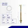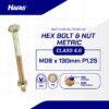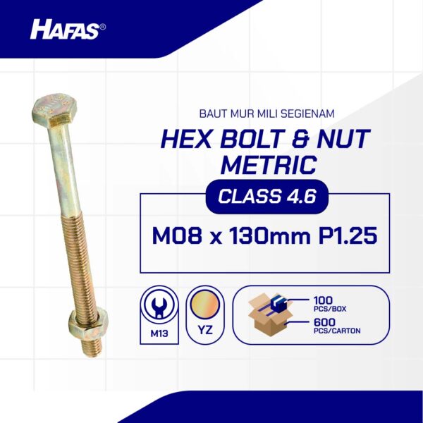 HEX BOLT AND NUT 4.6 METRIC DIN 931 YELLOW ZINC PLATED M08 X 130mm P1.25 n(DOUBLE HEX BOLT 4.6 DIN 931 YELLOW M08 X 130 P1.25)nnDiameter: M8nLength: 130mmnMaterial: IronnCoating: Yellow Zinc PlatednPitch: P1.25nKey: k13nStandard: DIN 931nClass: 4.6nHead Shape: Hexagonal HeadnMin Tensile Strength (Mpa):400