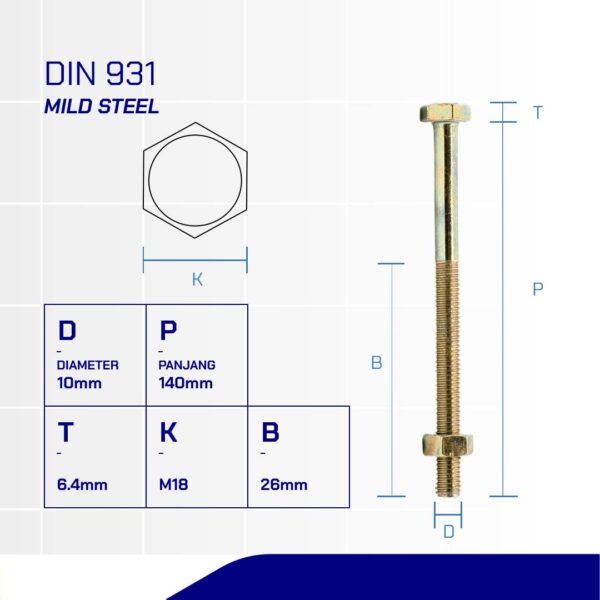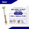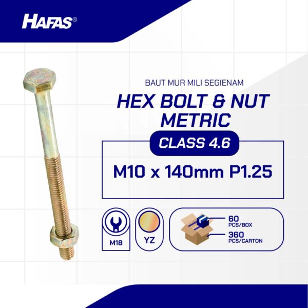 HEX BOLT AND NUT 4.6 METRIC DIN 931 YELLOW ZINC PLATED M10 X 140mm P1.25n(DIN 931 YELLOW M10 X 140 P1.25 HEX BOLT AND NUT 4.6)nnDiameter: M10nLength: 140mmnMaterial: IronnCoating: Yellow Zinc PlatednPitch: P1.25nKey: k18nStandard: DIN 931nClass: 4.6nHead Shape: Hexagonal HeadnMin Tensile Strength (Mpa): 400