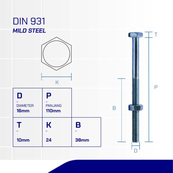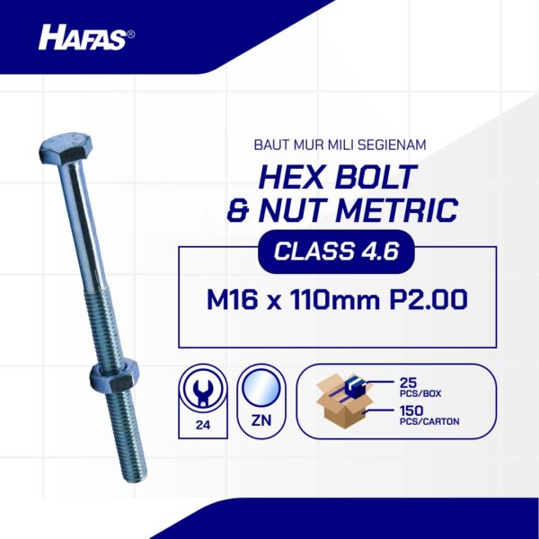 HEX BOLT AND NUT 4.6 METRIC DIN 931 WHITE M16 X 110mm P2.00 n(BOLT NUT HEXAGONAL 4.6 DIN 931 WHITE M16 X 110 P2.00)nnDiameter: M16nLength: 110mmnMaterial: IronnCoating: White Zinc PlatednPitch: P2.00nKey: k24nStandard: DIN 931nClass: 4.6nHead Shape: Hexagonal HeadnMin Tensile Strength (Mpa):400