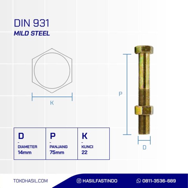 HEX BOLT AND NUT 4.6 METRIC FINE THREAD DIN 931 YELLOW ZINC PLATED M14 X 75MM P1.50 n(BOLT NUT HEXAGON FINE THREAD 4.6 DIN 931 YELLOW M14 X 75MM P1.50)nnDiameter: M14nLength: 75mmnMaterial: IronnCoating: Yellow Zinc PlatednPitch: P1.50nKey: k22nStandard: DIN 931nClass: 4.6nHead Shape: Hexagon HeadnMin Tensile Strength (Mpa):400nProof Load (Mpa):225