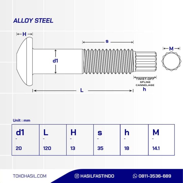 HIGH STRENGTH STRUCTURAL TENSION CONTROL BOLTS S10T BLACK OXIDE M20 X 120MM P2.50n(TENSION CONTROL BOLT BLACK M20 X 120MM P2.50)nnDiameter: M20nLength: 120mmnMaterial: S10T SteelnCoating: Black OxidenPitch: P2.50nKey: K32nStandard: S10TnClass: S10TnWeight: 523 grams