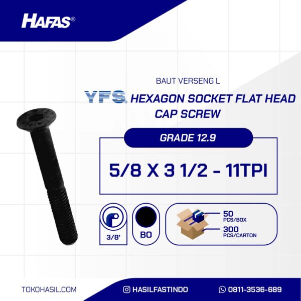 HEXAGON SOCKET FLAT HEAD CAP SCREW 12.9 BLACK OXIDE 5/8 X 3 1/2 inch 11TPIn(BOLT VERSENG L 12.9 BLACK 5/8 X 3 1/2 inch 11TPI)nnStandard: ASME B18.3nMaterial: Alloy SteelnCoating: Black OxidenThread Type: Half ThreadnDiameter: 5/8nLength: 3 1/2 inchnKey: 3/8’nPitch: 11TPInClass: 12.9
