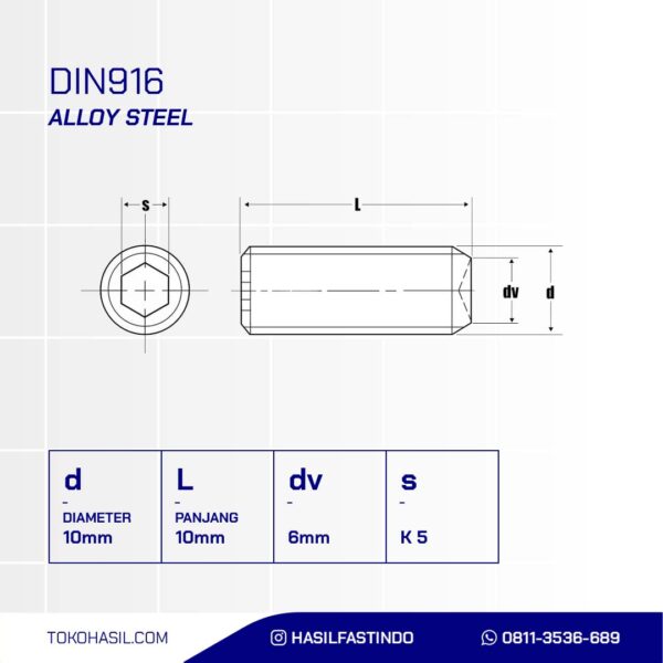 HEX SOCKET SET 12.9 M10 X 10 P1.50 BLACK OXIDEn(BOLT L PLANT STEEL 12.9 M10 X 10 P1.50 BLACK BURNED)nDiameter : M10nLength : 10mmnPitch : P1.50nMaterial : Steel 12.9nCoating : Black BurnednClass : 12.9nStandard : DIN 916nWeight : 10 grams