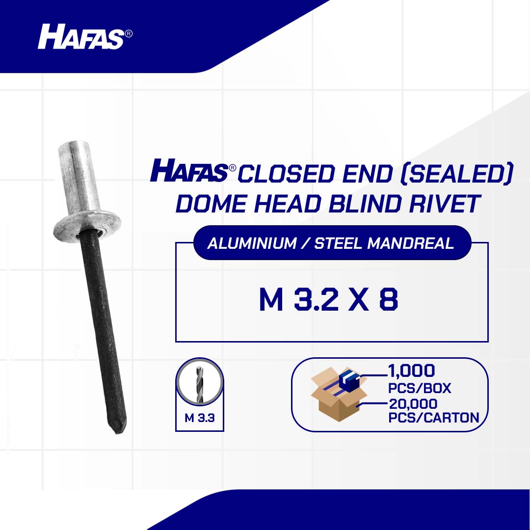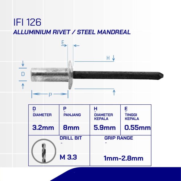 CLOSED END (SEALED) DOME HEAD BLIND RIVET WITH STEEL MANDREAL M3.2 x 18mmn(CLOSED END (SEALED) ALUMINIUM RIVET, STEEL MANDREAL M3.2 x 18mm)nnDiameter: M3.2nLength: 8mmnMaterial: Aluminium Rivet / Steel MandrealnCoating: PlainnDrill Bit: M3.3nStandard: DIN 7337 / IFI 114nHead Shape: Dome Head