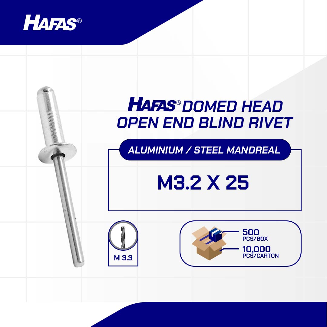 DOME HEAD OPEN END BLIND RIVET WITH STEEL MANDREAL M3.2 x 25mmn(DOME HEAD OPEN END RIVET ALUMINIUM, STEEL MANDREAL M3.2 x 25mm)nnDiameter: M3.2nLength: 25mmnMaterial: Aluminium Rivet / Steel MandrealnCoating: PlainnDrill Bit: M 3.3nStandard: DIN 7337 / IFI 114nHead Shape: Dome Head