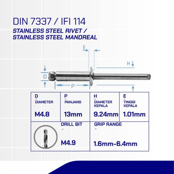 DOME HEAD OPEN END BLIND RIVET WITH STAINLESS STEEL MANDREAL M4.8 x 7.6mmn(DOME HEAD OPEN END STAINLESS RIVET, STAINLESS MANDREAL M4.8 x 7.6mm)nnDiameter: M4.8nLength: 7.6mmnMaterial: Stainless Steel Rivet / Stainless Steel MandrealnCoating: Stainless SteelnDrill Bit: M 4.9nStandard: DIN 7337 / IFI 114nHead Shape: Dome Head