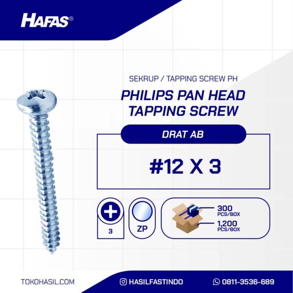 PHILIPS PAN HEAD TAPPING SCREW ZINC PLATED #12 X 3 n(TAPPING SCREW PH+ WHITE #12 X 3 )nnDiameter: #12nLength: 3 inchnMaterial: SteelnCoating: White Zinc PlatednScrewdriver: 3nStandard: DIN 7981nHead Shape: Pan Head