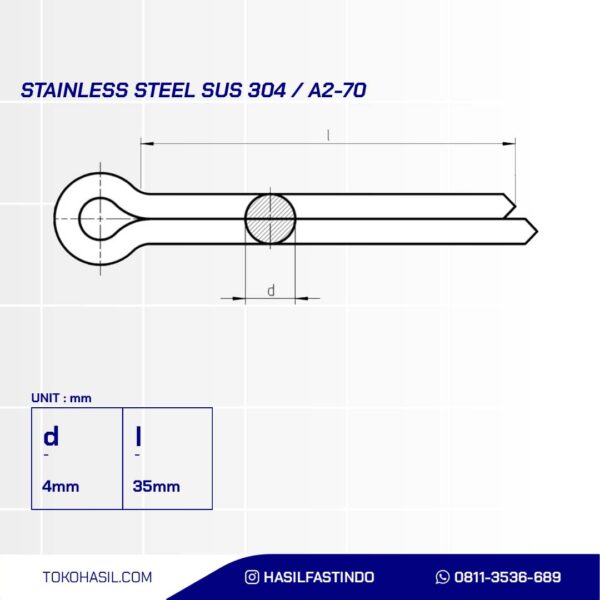 COTTER PINn(COTTER PIN STAINLESS SUS 304 M4 X 35mm)nDiameter : M4nLength : 35mmnMaterial : Stainless Steel 304nCoating : Stainless Steel