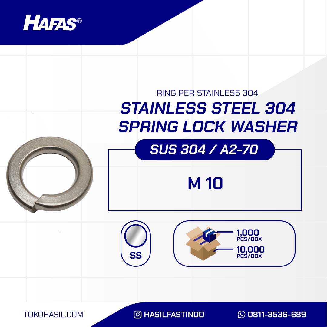 SPRING LOCK WASHER SUS 304 M10n(RING PIR SUS 304 M10)nnInner Diameter: 10.2mmnOuter Diameter: 18.1mmnThickness: 2.2mmnMaterial: Stainless Steel 304nStandard: DIN 127BnWeight: 2.59 grams