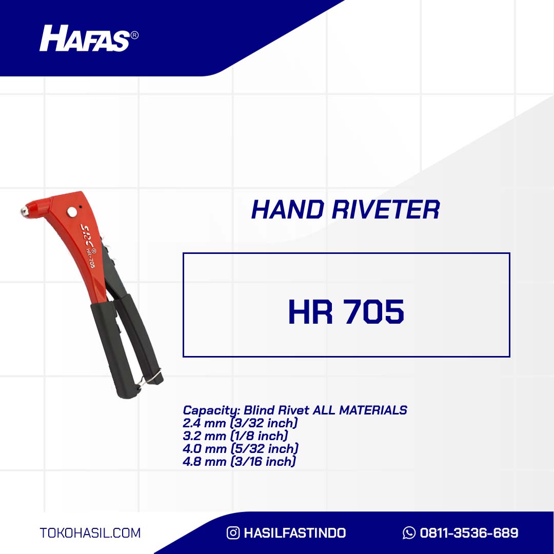 TANG RIVET HR 705n(HAND RIVET HR 705)nnn- 2-Jaw designn- High-grade aluminum die cast housing with carbon steel metal forming and heat treated handlen- Jaw & Jaw Case are made of chrome steel and heat treatedn- SRC hand riveters are particularly suitable for home and small quantity repairsn- Perfect for DIY marketnnLength: 255mmnnCapacity: Blind Rivet ALL MATERIALSn2.4 mm (3/32 inch)n3.2 mm (1/8 inch)n4.0 mm (5/32 inch)n4.8 mm (3/16 inch)