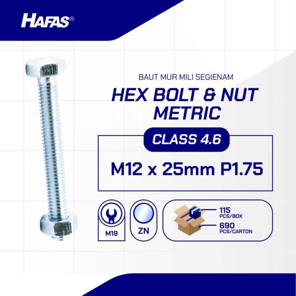 HEX BOLT AND NUT 4.6 METRIC DIN 933 PUTIH M12 X 25mm P1.75