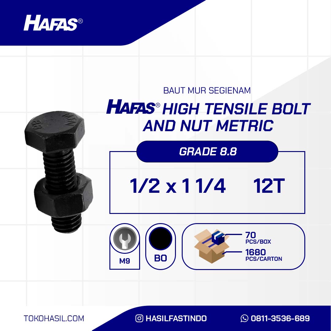 HIGH TENSILE HEX BOLT AND NUT 8.8 UNC DIN 933 HITAM 1/2 X 1 1/4 12TPI n(BAUT MUR UNC SEGIENAM BAJA 8.8 DIN 933 HITAM 1/2 X 1 1/4 12TPI )nnDiameter: 1/2″nPanjang: 1 1/4″nBahan: Besi BajanLapisan: Black OxidenPitch: 12TPInKunci: k3/4nStandard: DIN 933nClass: 8.8nBentuk Kepala: Kepala SegienamnMin Tensile Strength (Mpa):120000nMin Yield Strength (Mpa):92000nProof Load (Mpa):85000