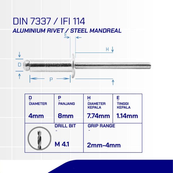 (PAKU RIVET DOME HEAD OPEN END ALUMINIUM, MANDREAL BESI M4 x 08mm)