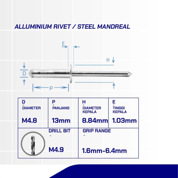 (PAKU RIVET MULTI GRIP ALUMINIUM, MANDREAL BESI M4.8 x 17.5mm)