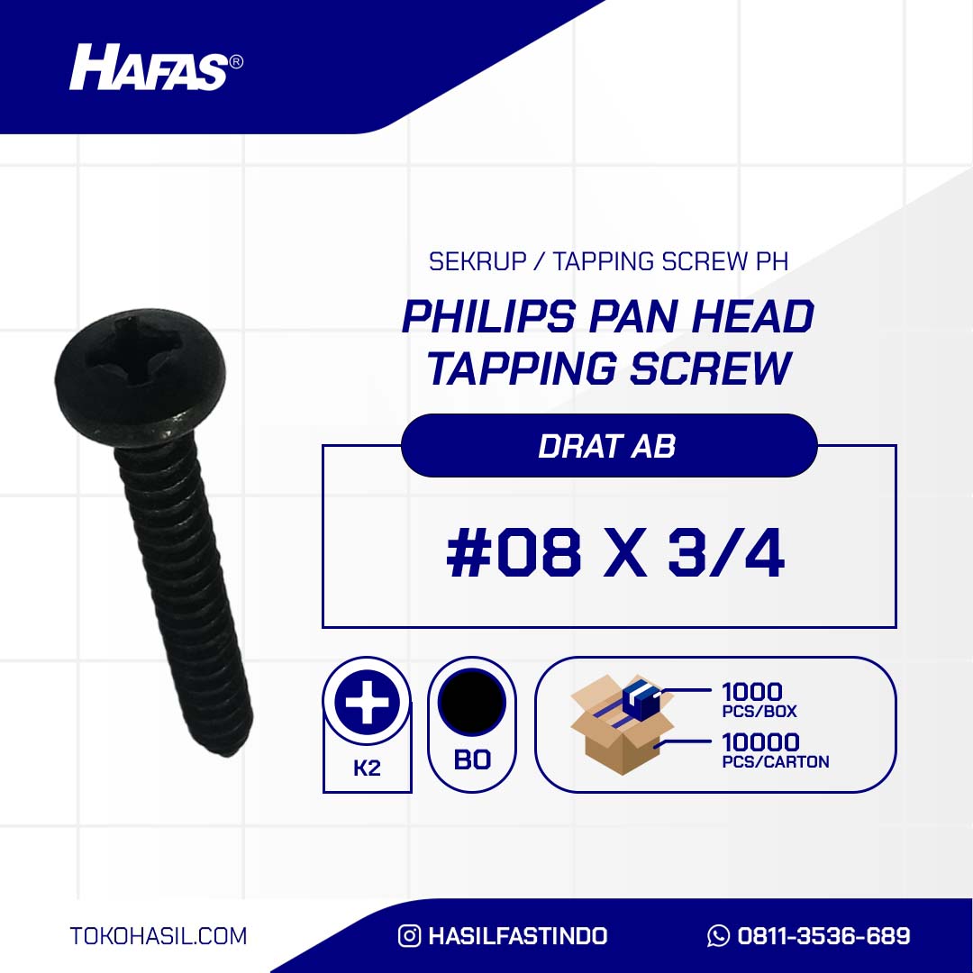 PHILIPS PAN HEAD TAPPING SCREW BLACK OXIDE #08 X 3/4 n(SEKRUP TAPPING PH+ HITAM #08 X 3/4 )nnDiameter: #08nPanjang: 3/4 inchnBahan: Besi BajanLapisan: Black OxidenObeng: 2nStandard: DIN 7981nBentuk Kepala: Kepala Pan
